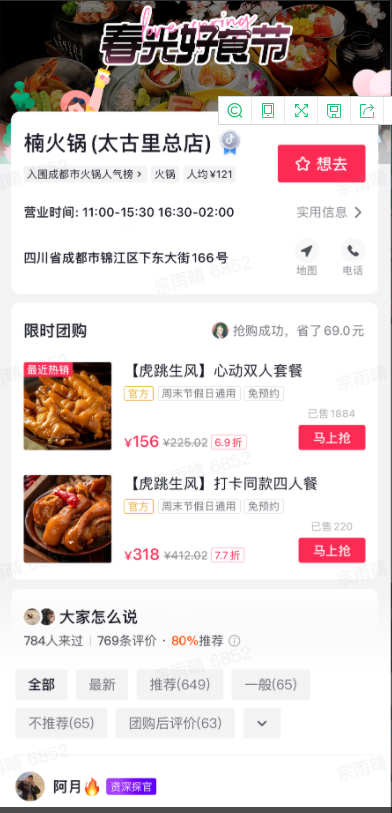 套餐价格: 踏青节专属福利价格,如: 春季无限福利单品、3.14折嗨购福利、会员充值赠礼品等市集美食品尝展览