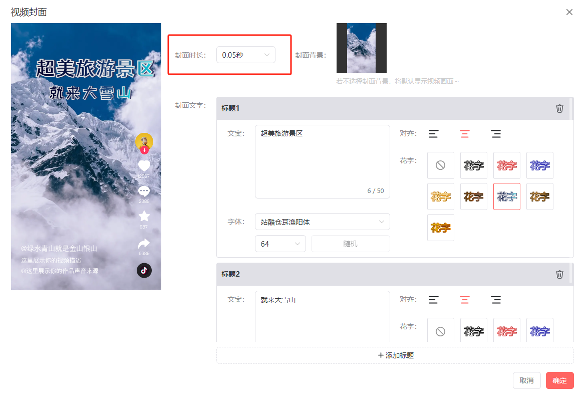 可以自定义多张封面图,系统将给视频随机匹配任意一张封面图。视频封面还可以进行【封面时长】、【封面背景】上传、【封面文字】等多样式设计。