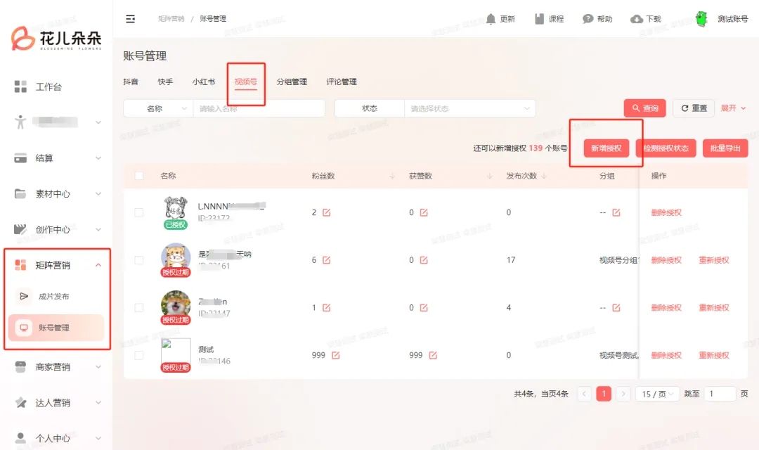 与抖音、小红书等平台的操作一样,点击花儿后台的【新增授权】,手机端打开微信扫码,同意授权即可完成绑定。