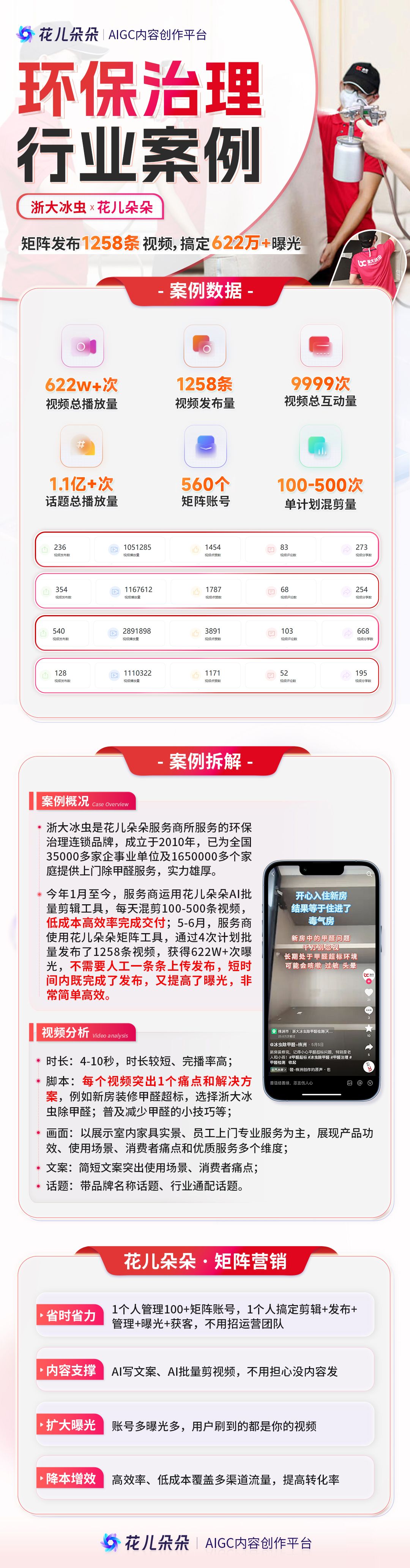 关键词:短视频,短阵,抖音,花儿朵朵,浙大冰虫,矩阵营销,环保治理,除甲醛,AI,AIGC,批量混剪,视频剪辑