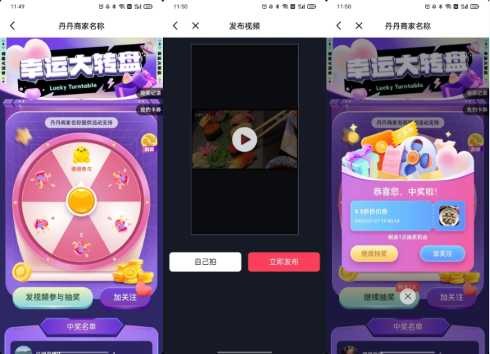 在发视频得优惠券的基础上新增了幸运大转盘玩法,增加了奖品福利,用户扫码后需要先发送视频才能获得抽奖资格,转盘奖品由商家自定义